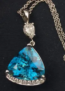 At Copeland Jewelers we’re excited to show off our fabulous custom made blue zircon pendant. Crafted by Clay Copeland, it’s an original and one-of-a-kind. Come by and see it before it’s gone.
